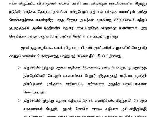 MADURAI: The Madurai police has issued a traffic advisory informing the public about the traffic diversion and route advisory in view of Prime Minister Minister Mr.Narendra Modi’s visit to Madurai tomorrow- on February 27th 2024.