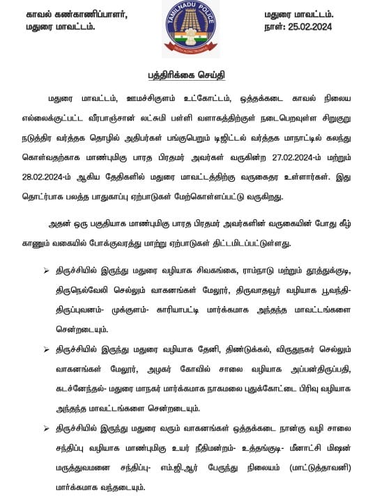 PM VISIT TO MADURAI: TRAFFIC DIVERSION ON FEBRUARY 27th and 28th; POLICE ISSUES ADVISORY