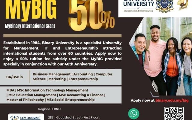 Established in 1984, Binary University is a well-known university in Malaysia for important courses in management, IT and entrepreneurship attracting international students to Malayia from several countries. Those who apply now can enjoy a 50 per cent tuition fee subsidy under the ‘MyBIG’ international grant provided to commemorate the 40th anniversary of BINARY UNIVERSITY (management and entrepreneurship) offering BA and B.Sc courses, a press release here has informed yesterday.