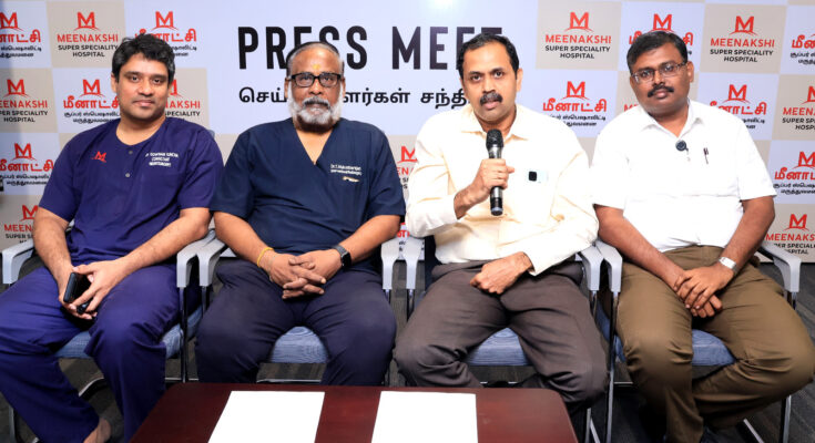 A press conference was held at Meenakshi Super Speciality Hospital in Madurai today which was addressed by senior consultant and Head of Department of Neurosurgery Dr.Selva Muthu Kumaran along with Dr.T.Mukuntharajan, HoD of Department of Interventional Radiology, Dr.Gowtham Kuncha. consultant neurovascular surgeon and Dr.K.Senthil Kumar, senior consultant neurosurgeon.