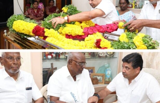 A large number of people turned up to pay their respects and homage at the residence of 88-yrs-old Solomon Pappaiah in Madurai. Tamil Nadu Minister for Information Technology and Digital Services Mr.P.T.R.Palanivel Thiaga Rajan had paid his respects and homage by laying a wreath and he consoled the family members.