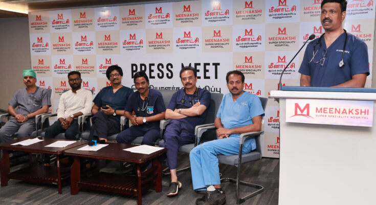 A press meet was organized in Madurai yesterday-February 28th 2025- where the cardiology team and vascular experts had explained about the Endovascular Aortic Aneurysm Repair (EAVR) that was done successfully for the male patient at Meenakshi Super Speciality Hospital here and those who briefed the media include Dr.R.Sivakumar, Head of Department, Institute of Cardiac Sciences, Dr.Prabhu Kumarappan Chidambaram, vascular surgeon, Dr.N.Ganesan, senior consultant, Institute of Cardiac Sciences, Dr.M.Sampath Kumar, senior consultant, Dr.Selvamani, senior consultant and Dr.Jeyapandian, senior consultant along with Dr.Thomas Xavier, associate consultant and Dr.S.Kumar, Head of Department, Cardiac Anaesthesiology.