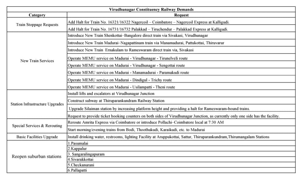 MADURAI: Lok Sabha MP of Virudhunagar constituency Mr.B.Manickam Tagore has submitted a list of railway development proposals with a detailed representation outlining key railway related demands for the Virudhunagar constituency in order to improve train connectivity, infrastructure and create more passenger amenities in the region.