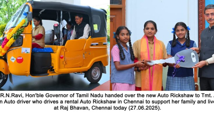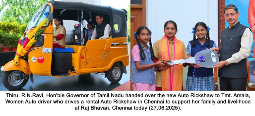 MADURAI: Tamil Nadu Governor Mr.R.N.Ravi had handed over a new auto rickshaw to a woman auto driver Mrs.Amala by inviting her to Raj Bhavan in Chennai today-June 27th 2025.