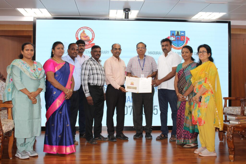 Dr.B.George, Principal in-charge, MKU College-Madurai, Dr.P.Kabilan, vice-principal and Dr.L.Sangeetha, librarian had signed the MoU on behalf of the college while the Chief Librarian and Information Officer of Kalaignar Centenary Library Dr.V.Dinesh Kumar along with senior library team of KLC- Mr. V.Santhanakrishnan, Dr.J.Jebajoslin, Mrs.V.O.Saritha and assistant librarians, information officers and other librarians.