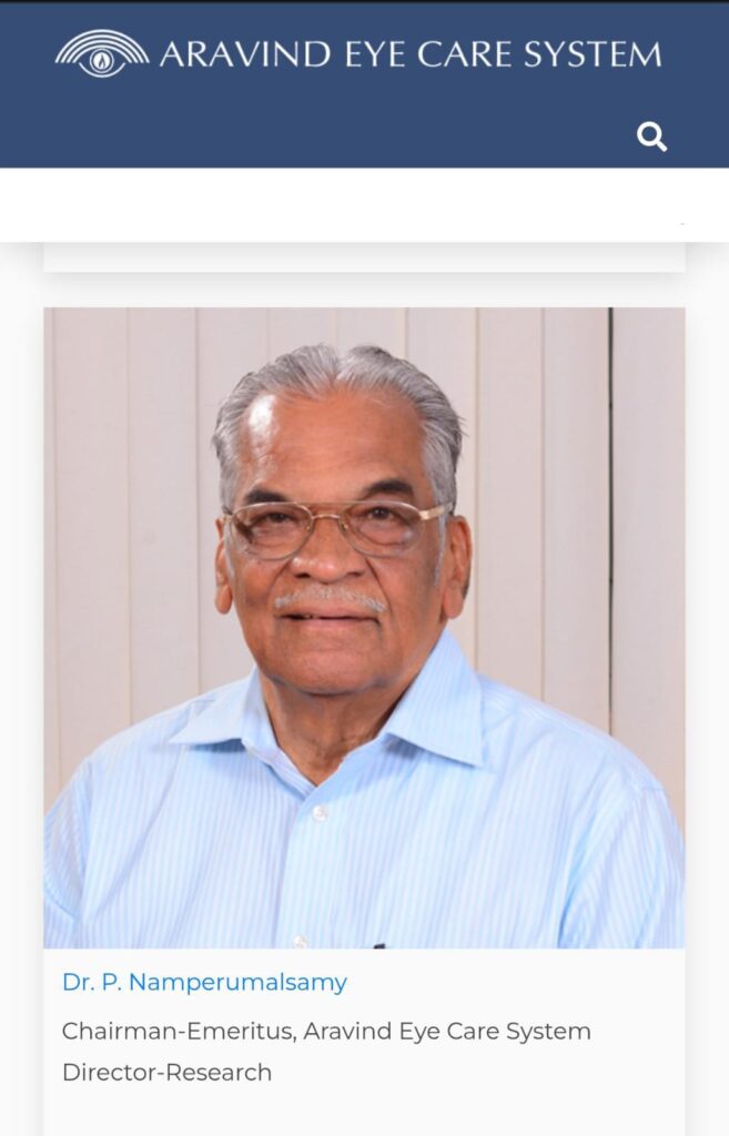 Dr.P.Namperumalsamy is the Chairman Emeritus of Aravind Eye Care System and was one of the founder members team when the Aravind Eye Hospital was started a few decades back in Madurai by late Dr.Venkatasamy.
