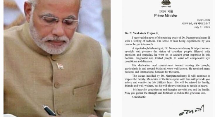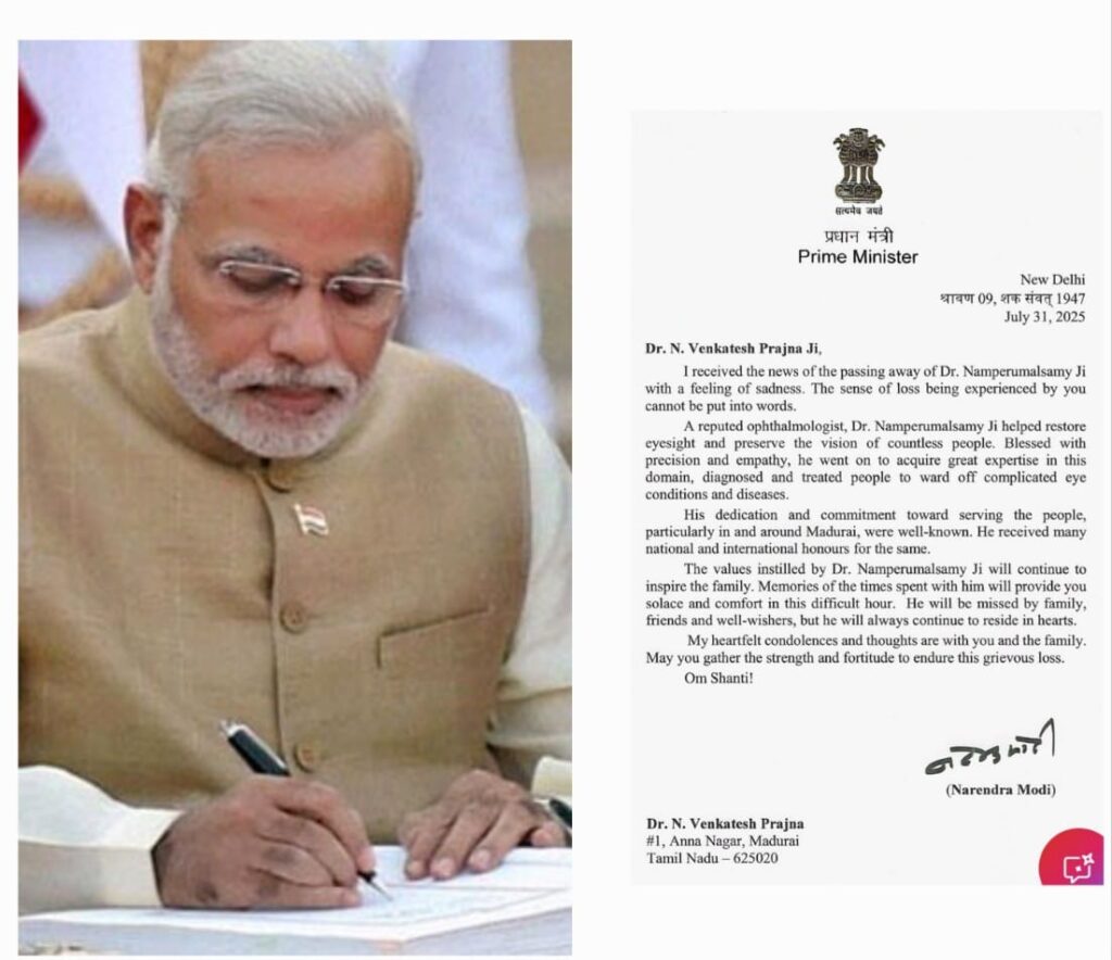 The Prime Minister’s letter dated July 31st 2025 was sent to his son Dr.N.Venkatesh Prajna expressing has sense of deep sadness over the passing away of Dr.P.Namperumalsamy, Chairman Emeritus, Aravind Eye Care System.