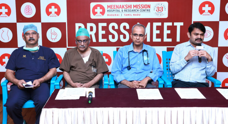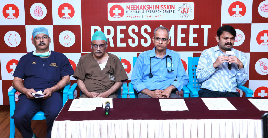Meenakshi Mission Hospital press meet in Madurai on August 12th 2025. (L to R) Dr.N.Mohan, Dr.Ramesh Ardhanari, Dr.K.Sampath Kumar and Dr.B.Kannan.