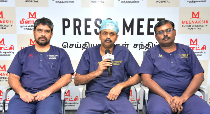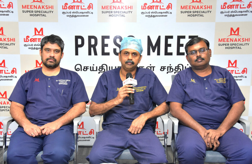 Dr.K.Selvamuthukumaran, senior consultant and Head of Department of Neurosurgery, Dr.K.Senthilkumar, senior consultant neurosurgeon and Dr.Gowtham Kuncha, consultant endovascular neurosurgeon had given details of this successful operation proecudres at a press meet in Madurai today- November 7th 2025.