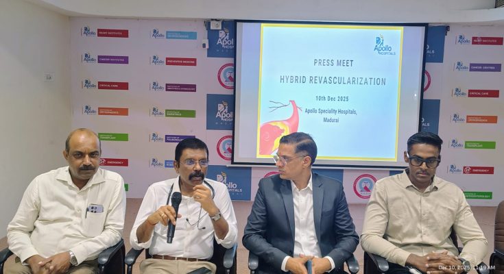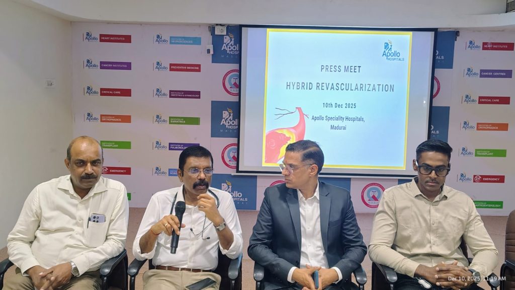 The details about Hybrid Revascularisation were explained at a press meet here today-December 10th 2025-by senior pulmonologist Dr.M.Palaniappan and vascular surgeon Dr.K.S.Venkata Prasanna along with Dr.Nikhil Tiwari, Chief Operating Officer, Apollo Speciality Hospitals and Dr.K.Praveen Rajan, Joint Director-Medical Services.