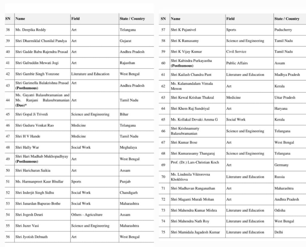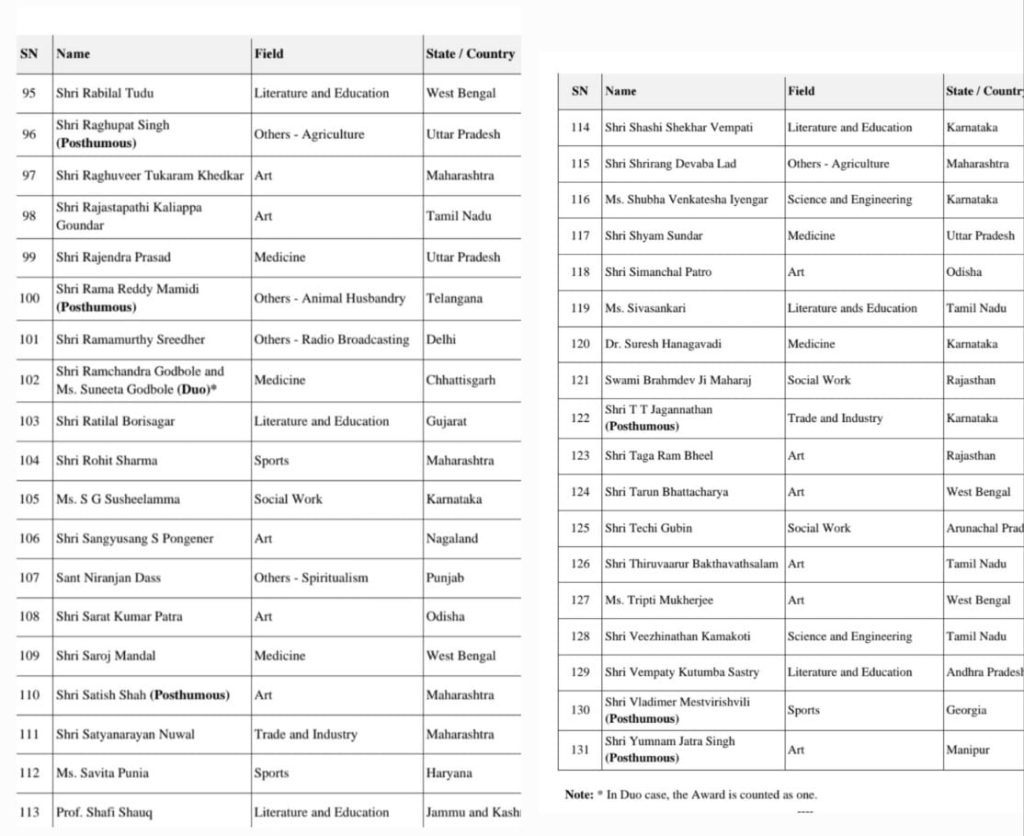The President of India has approved conferement of 5 Padma Vidbhushan awards, 13 Padma Bhushan awards and 113 Padma Shri Awards to distinguished personalities in various fields, and a press release of the Padma Awardees 2026 list was released by the Ministry of Home Affairs of Govenrment of India today evening.