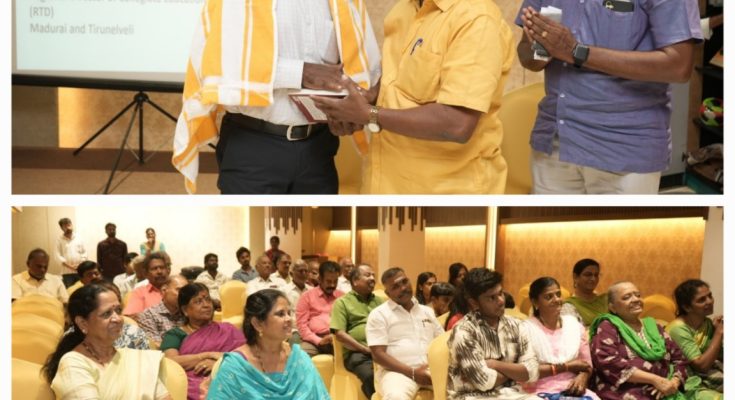 Kalaignar Centenary Library chief librarian Dr.Dhineshkumar being felicitated by SARA Foundation chairman Prof.G.Ramamoorthy in Madurai on April 26th 2026.